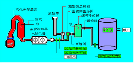 如圖2可見,在回收側(cè)盅形閥/分散側(cè)盅形閥前布設(shè)煙氣在線分析儀,只有當(dāng)通過CO在線監(jiān)測系統(tǒng)測得轉(zhuǎn)爐煤氣中的CO濃度在30%以上時,才打開氣體切換站的回收側(cè)盅形閥進(jìn)入煤氣柜儲存,否則通過分散側(cè)盅形閥通過放散塔點(diǎn)火燃燒。在煤氣柜前布設(shè)煙氣在線分析儀,只有在線監(jiān)測系統(tǒng)測分析保證煤氣柜內(nèi)O2含量不會超標(biāo)(控制在1%以下)才允許焦煤煤氣進(jìn)入煤氣柜,否則啟動停止回收,以保證系統(tǒng)的穩(wěn)定性和安全性。