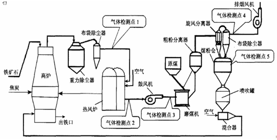 (1)監(jiān)測點(diǎn)1:高爐煤氣分析,CO和CO2,控制高爐爐況和回收能源氣;