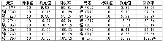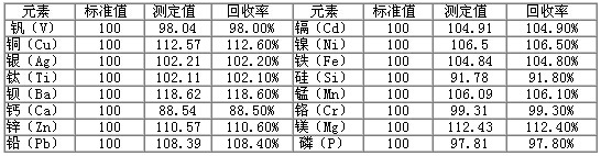 采用本方法測(cè)試潤(rùn)滑油金屬含量光譜分析標(biāo)準(zhǔn)物質(zhì)GBW(E)130129、GBW(E)130132,對(duì)比實(shí)際測(cè)定值與標(biāo)準(zhǔn)值,得出實(shí)際測(cè)試的回收率,得到準(zhǔn)確度數(shù)據(jù),結(jié)果見(jiàn)下表