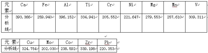 根據(jù)ICP軟件譜線庫(kù)提供所有元素不同譜線,首先選擇被測(cè)元素靈敏度高的譜線,其次考慮不受樣品基體及被測(cè)元素相互之間干擾小的譜線的原則,選擇分析線如下。