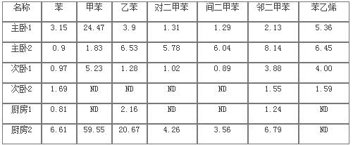 在剛裝修完的兩套住宅的三處不同地點(diǎn)進(jìn)行取樣并分析7種苯系物的含量,測試結(jié)果見表7。