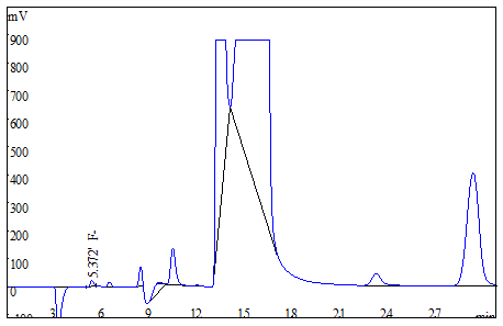 將大米、茶葉試樣分別粉粹后過篩,各稱取0.25g(精確至0.0001g),于氧彈燃燒儀進(jìn)行燃燒,冷卻后定容,經(jīng)0.22μm的水系濾膜過濾后上機(jī)得到樣品譜圖,如下圖3、圖4所示;食用油樣品直接稱重后進(jìn)行氧彈燃燒,測試得到的譜圖如圖5所示;生活飲用水直接上機(jī)后得到樣品譜圖詳見圖6。其中大米、茶葉、食用油中氟離子的測定結(jié)果均低于方法檢出限,同時(shí)對(duì)4種試樣進(jìn)行了加標(biāo)處理,加標(biāo)回收率在95.6%~102.3%之間。測試數(shù)據(jù)詳見表2。
