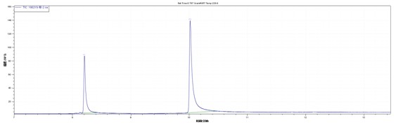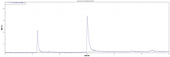 目標物在5ppm-100ppm線性良好。取空白食品樣品加標,樣品經(jīng)過正己烷和乙酸乙酯(1+1)超聲萃取。20ppm加標水平下譜圖如下,得到了比較滿意的效果。