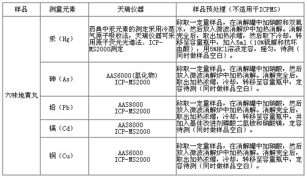 天瑞儀器參考《中華人民共和國藥典》,采用原子吸收光譜儀(AAS6000;AAS8000)、原子熒光光譜儀(AFS200系列)、電感耦合等離子體質(zhì)譜儀(ICP-MS2000),對六味地黃丸中鎘、鉛、銅、砷、砷、汞等重金屬的測定進行研究,測試結果準確度高,重復性好。